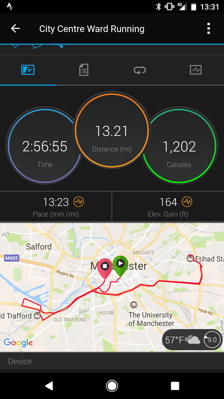Kept it steady, couldn’t believe I was holding onto this steady pace and wondered how long it would last, took on water at water station but at same time did’nt want too much in case it made me want to stop, I was determined not to but decided I would review how I felt when I got back to the water station at 6 miles. I was still heading uphill but I turned left and could see the Ethiad stadium the turning point of the route.